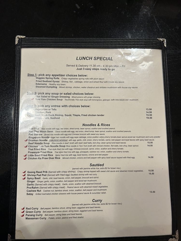 Little Basil, located in New York, offers a variety of appetizers, soups, and noodle soups, with vegan and vegetarian options. The cozy ambience and attentive service make it a great spot for lunch or dinner. The menu includes dishes like Veggies Rolls, Tom Yum Soup, and Beef Noodle Soup. Customers praise the lunch special and generous portions, with standout dishes like the Drunken Noodles and Massaman Curry with duck. Friendly staff and BYOB policy add to the welcoming atmosphere. Overall, Little Basil impresses with its quality, price, and portions, making it a solid choice for Thai cuisine in the Murray Hill/Kips Bay area.