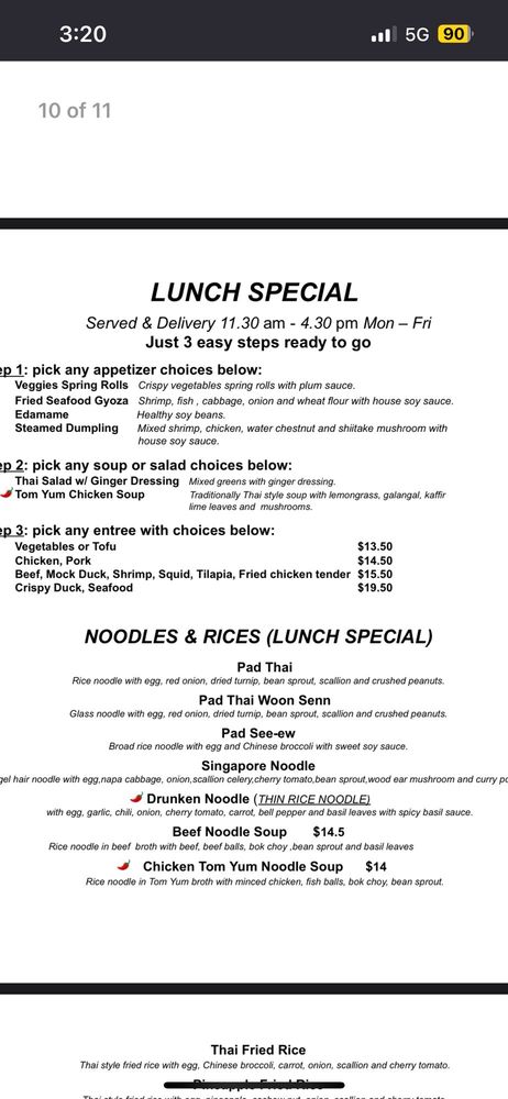 Glass noodles, minced chicken, shrimp, squid, red onion, scallion, cherry tomato, celery, culantro, fried garlic and cilantro with chili lime dressing. Spicy.