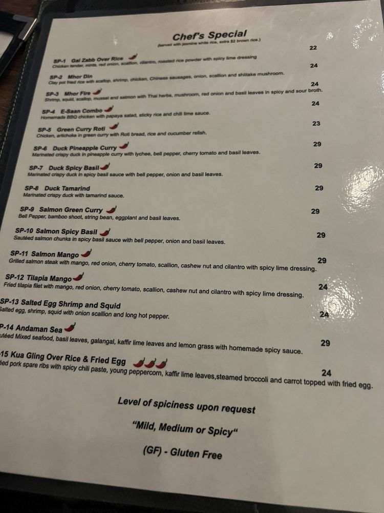 Chef's special Thai BBQ pork tender, mints, red onion, scallion, cucumber and cherry tomato with chili lime dressing. Spicy.